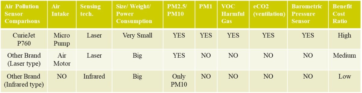 CurieJet P760 is the world’s smallest air quality & barometric altitude sensor, only 29 x 29 x 7.2 mm and 1/4 volume in the industry with I2C interface, which is a key component of drones, UAV(Unmanned Aerial Vehicle), UAS(Unmanned Aircraft System), RPAS(Remotely Piloted. Aircraft Systems),or aerial camera. Ultra-low power consumption, only about half of the industry. CurieJet® P760 monitors the concentration of PM2.5, PM10, PM1 particulate pollutants and VOC harmful gases in the air quality in the atmosphere; PM1 also cause for poor visibility.