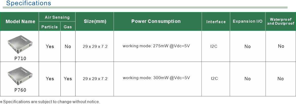 CurieJet® P760 是世界最小、超低功耗、專利領先的多合一空氣品質環境感測器模組,尺寸極小,只有29 x 29 x 7.2 mm,僅有業界1/16體積。運用鐳射並搭配米氏散射原理,去量測大氣中的PM2.5、PM10甚至PM1.0懸浮微粒與灰塵。P760還整合內建了BME688環境感測器,可量測VOC氣體、顯示通風狀態,並可感測氣壓數值,應用於天氣預報的晴雨表或估算海拔高度差異。也可偵測乙醇(Ethanol),成為酒精濃度感應器,或用於酒駕監測警示系統。